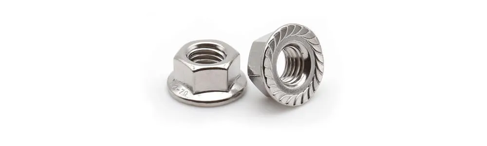 - Hex Flange Nut with serration(Lock Nut): The bottom of this nut has a serrated flange. When installed, the serrations bite tightly into the connected material and prevent loosening through friction.